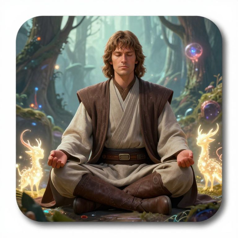 Star Wars Legends art showcasing a heroic Jedi master meditating on a serene forest planet, surrounded by glowing mystical creatures and ethereal light, detailed organic textures and subtle, harmonious color palette emphasizing peace and strength.