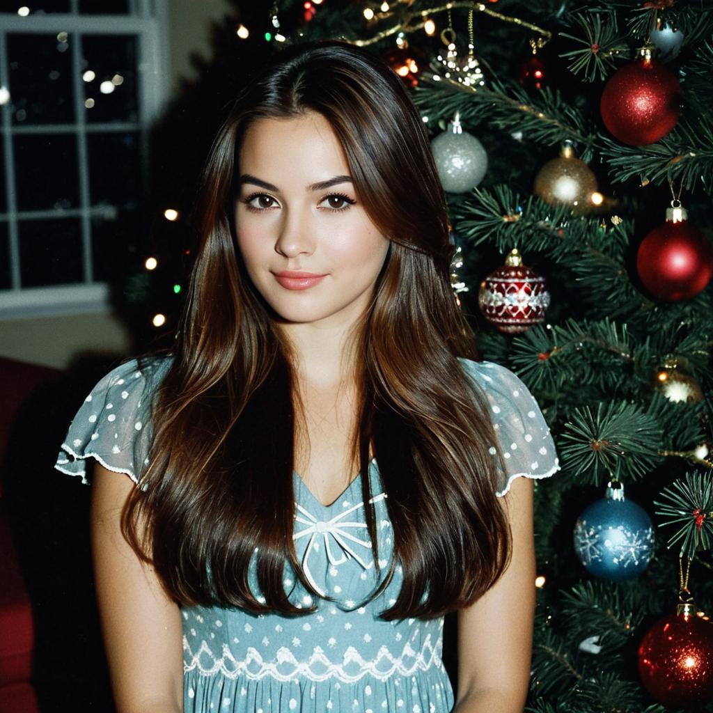 Custom christmas sweaters,1girl, solo, christmas tree, sweater, long hair, brown hair, christmas, realistic, looking at viewer, lips
