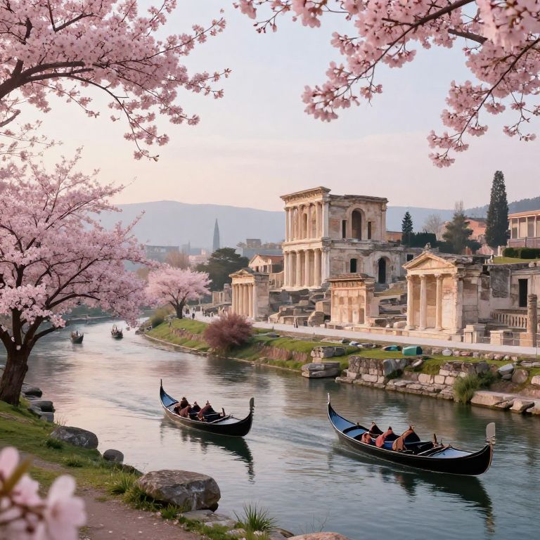 Olympia, panoramic view of a tranquil early morning at the archaeological site, gondolas floating on a nearby river, blossoming cherry trees framing the ancient ruins, soft pastel colors and dreamlike quality, blending history with fantasy.
