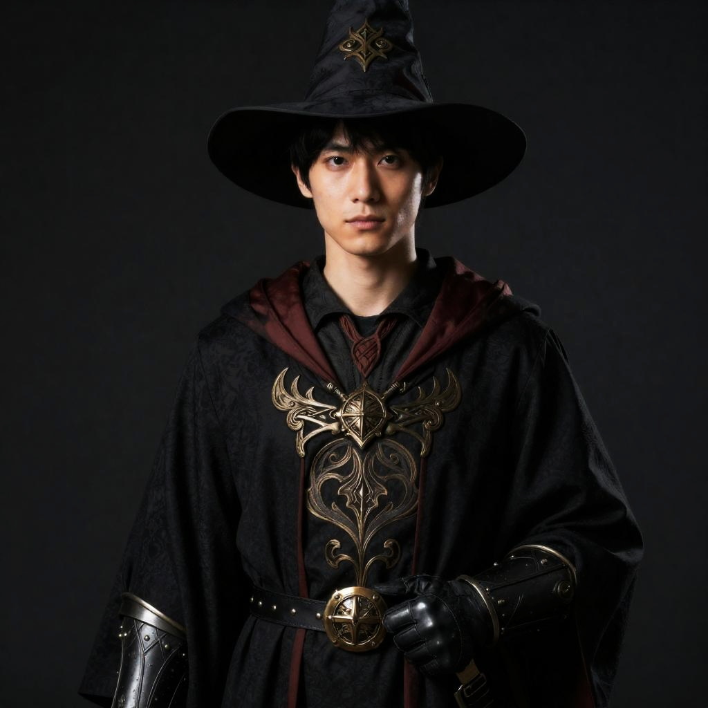 Photorealistic portrait of an Asian male dressed in an intricate wizard costume featuring a black wide-brimmed wizard hat with a gold emblem, a dark robe with elaborate gold detailing, a black glove, and matching hand guards. The subject has short black hair and is highlighted with two-tone lighting against a dark background, creating a dramatic and mysterious atmosphere.