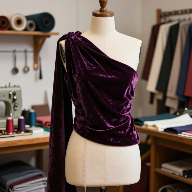 Photograph of a white dress form wearing a deep purple velvet one-shoulder top with a long, flowing sleeve. The fabric has a soft, luxurious texture. The dress form is positioned in a well-lit sewing room with a vintage green sewing machine on a wooden table to the left. In the background, a wooden shelf holds rolled fabrics, and a clothing rack displays various garments. The room has a cozy, organized atmosphere with natural light filtering in.