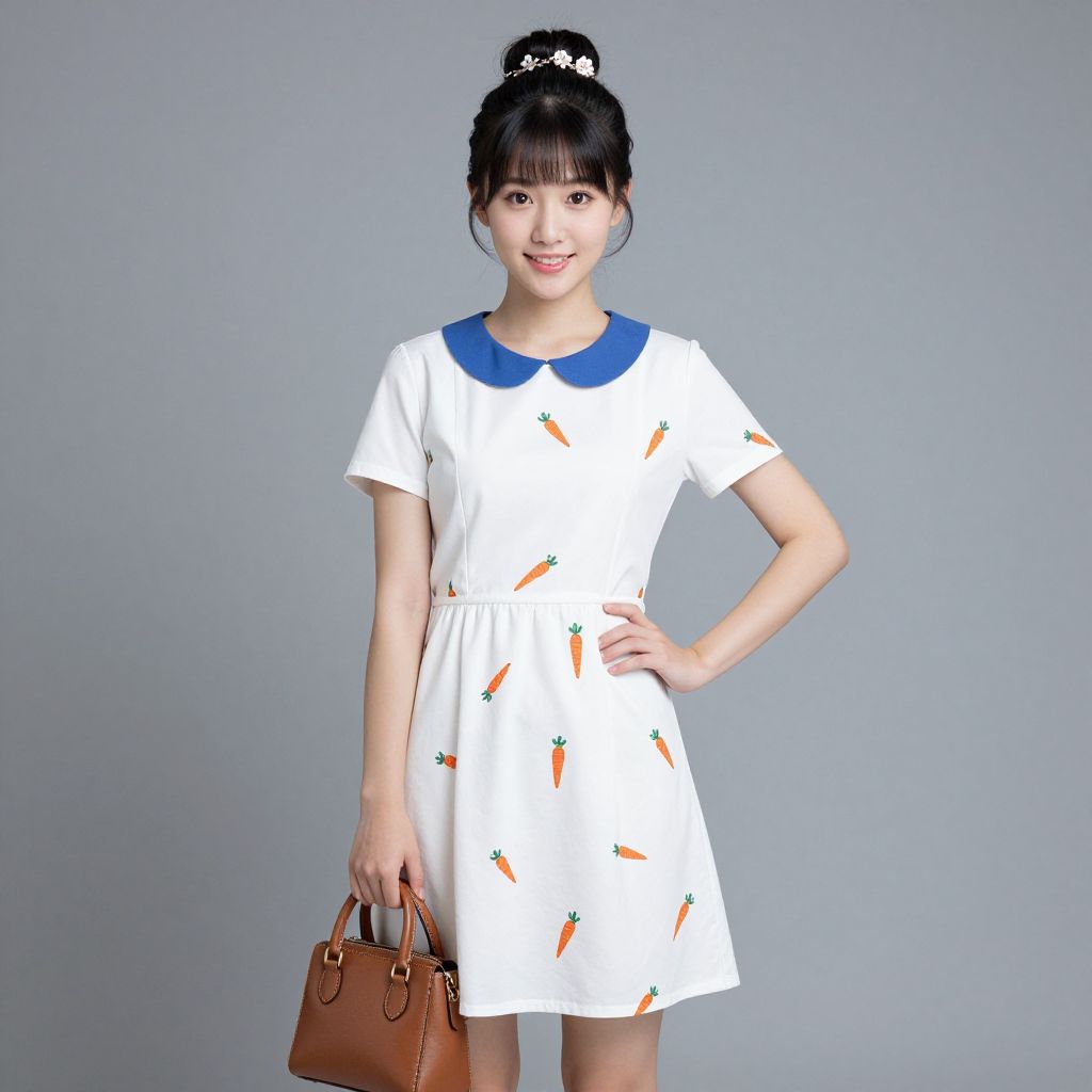 Photograph of an Asian woman with fair skin and black hair in a bun, wearing a white, short-sleeved, knee-length dress adorned with small orange carrot prints. The dress has a blue Peter Pan collar. She stands against a plain gray background, smiling, with one hand on her hip and the other holding a brown leather handbag. She also wears a white hair accessory with small bows. The image is brightly lit, emphasizing the simplicity and freshness of her outfit. The overall style is casual and cute.