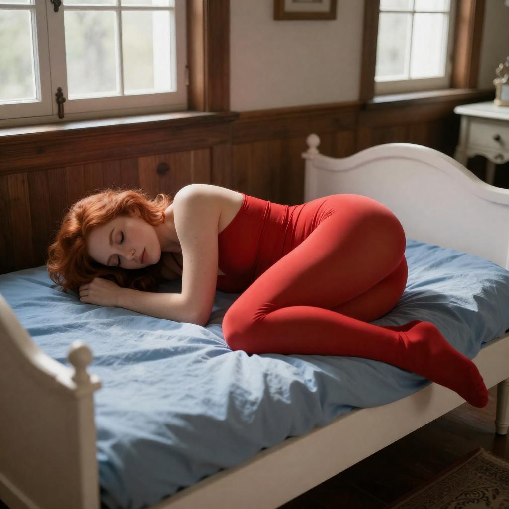 Photograph of a woman with red hair and fair skin, wearing a bright red, form-fitting bodysuit, lying curled on a white, vintage-style bed with blue bedding. She rests her head on her arm, eyes closed. The room has wooden walls, hexagonal-patterned windows, and a white, ornate bedside table. Sunlight streams through the windows, casting soft shadows.
