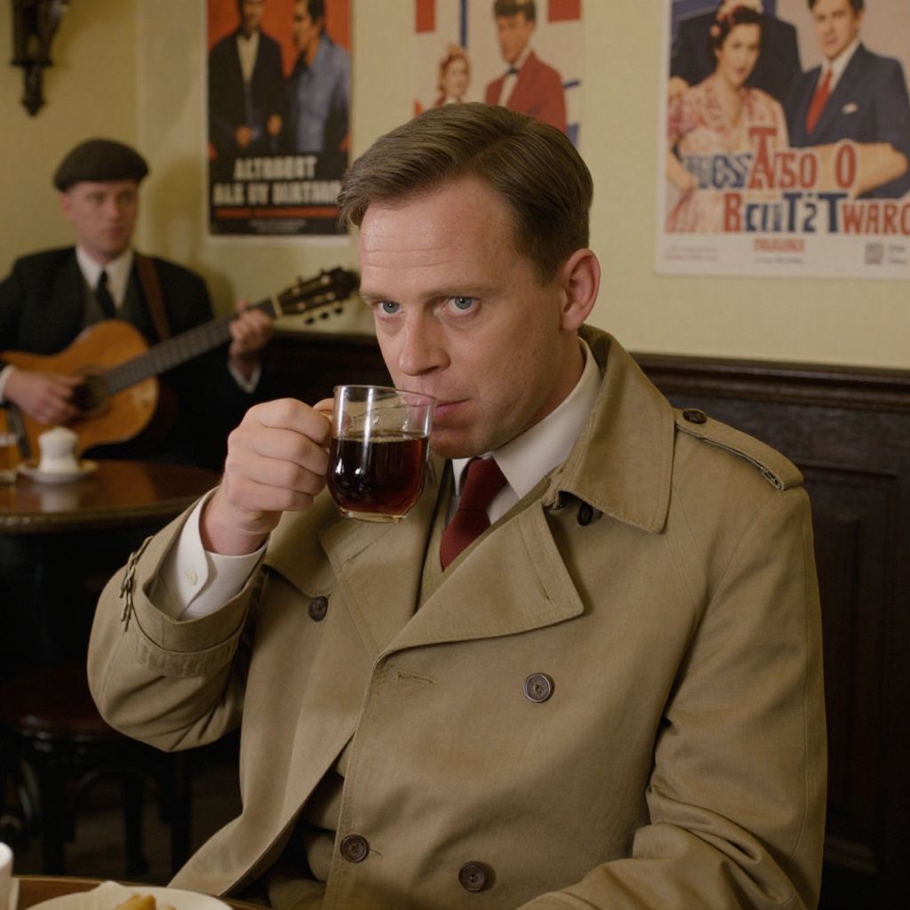 A well-lit indoor scene of a man in a Tommy Shelby costume, seated in an old-style British pub, sipping black tea, wearing a trench coat over a white shirt with a red tie, his face showing a calm but intense expression, with the sound of traditional music fading in the background and vintage posters of classic British films on the walls.