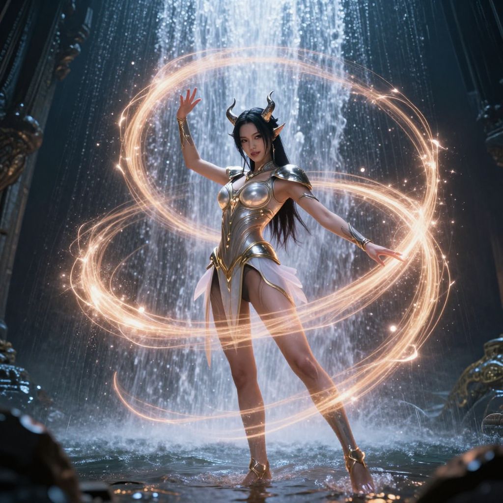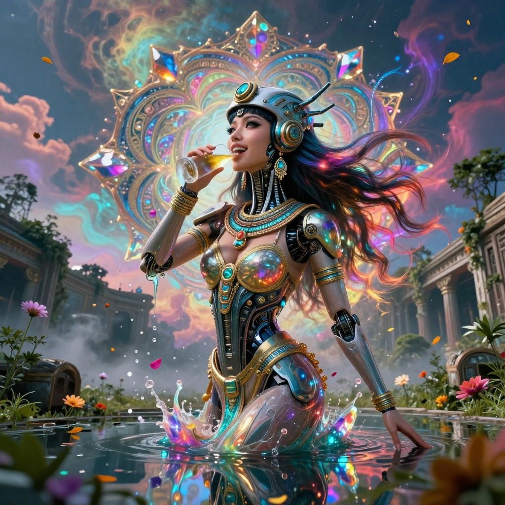 (otherworldly), highly insanely detailed, masterpiece, top quality, best quality, highres, 4k, 8k, RAW photo, ((ancient egyptian theme:1.2)), taiwan, korean, ((post-apocalyptic:1.2)), abandoned building, overgrown with vegetation, mythical, reflection, reflective floor, cloudy sky, (volumetric fog, mist:0.8), cinematic lighting, colorful, colourful, dawn, colourful crystalline, colourful crystal structure, translucent colourful bioluminescent, (colourful magical glow, colourful magical:0.8), flower, falling petals, petals on liquid, petals, (mandala, nebula, fractal art, liquid splash, fluid, wet, dripping, waxy, smooth:0.5), (dreamlike, dream like, dream-like, dream-like atmosphere), (long hair, glowing hair, hair over one eye, long messy hair), (eyelashes, eyeliner, eyeshadow, eyelashes, long eyelashes), collar, earrings, jewelry, necklace, armlet, nsfw, cleavage, perfect body, makeup, action pose, drunk, biting, (from side, looking to the side), mature female, brown eyes, :o, large breasts, thick thighs, wide hip, a woman sitting on a wooden bench wearing a dress and stockings with a bow tie on her neck and a backpack, sit, spread legs, school uniform, white ((pantyhose)), high heels, darkened sky, raining, cumulonimbus, ((upper body)), from above:1.1, (fantasy world)