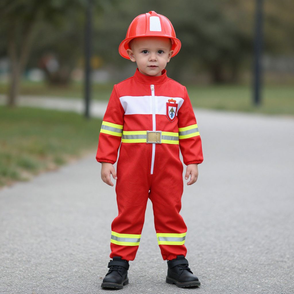"fire truck toddler costume, 1boy, male focus, solo, full body, helmet, standing, jumpsuit, looking at viewer, black footwear Realistic photo of casual sexy person with pretty face"