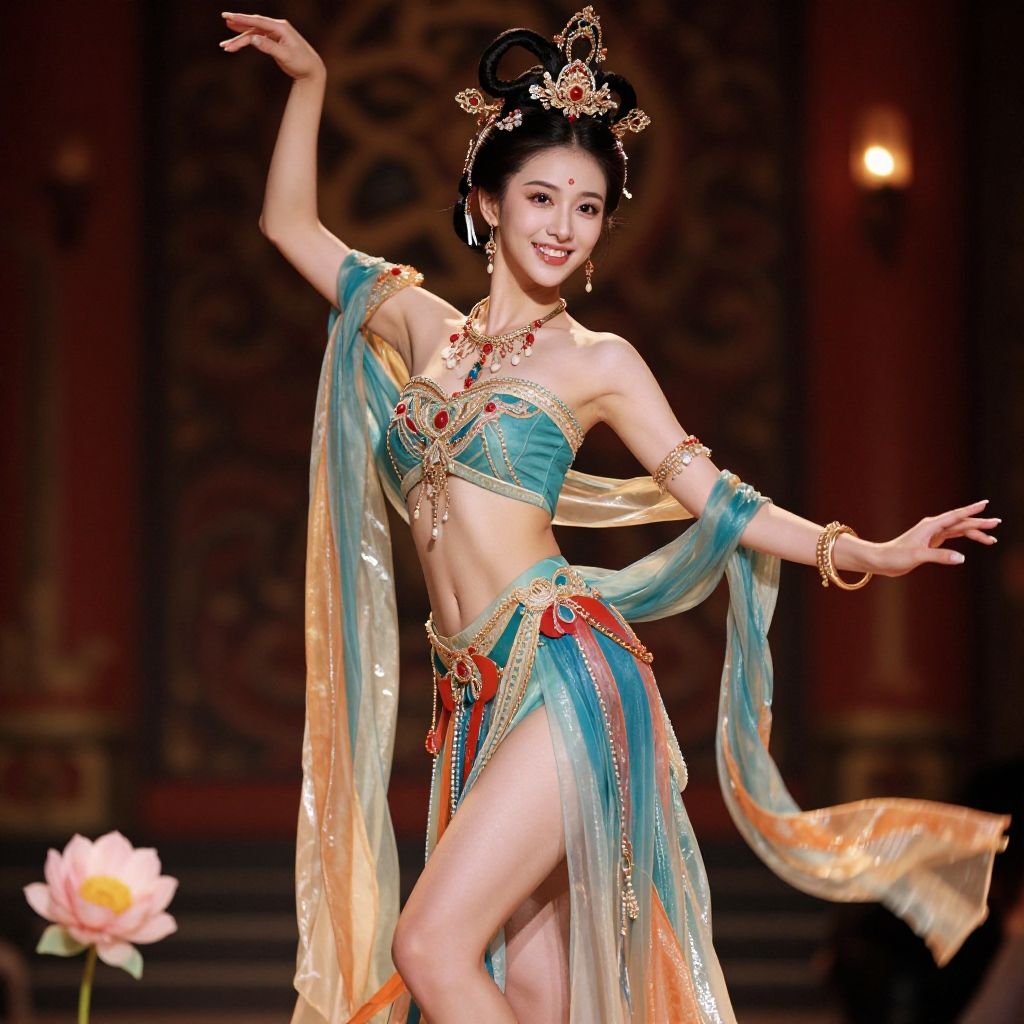 (goddess-like, hot and cute girl, flirtatious, seductive:1.4), (RAW photo:1.2), (photorealistic:1.6), (lens 135mm, f1.8:1.2), (ultimate quality, masterpiece:1.3), (intricate details:1.2), (detailed face:1.2), dramatic, ray tracing, fashion photograph, fFaceDetail, Full body, good hands, (nsfw), Sharp focus, cinematic lighting, (dunhuang, Chinese Dunhuang Flying Fairy, floating clothes, floating flower, pov legs, thighs, dunhuang cloths, hanfu, waist cape, strapless, navel, robe:1.2), zanhua, dancing, (1girl, solo, catwalk, runway:1.6), confident smile, beautful face, (medium breasts, narrow waist:1.2), sexy body, perfect body, shiny hairs, hair ornament, earrings, necklace, jewelry, confident, showcasing, buzzing atmosphere, (anatomically correct hands:1.5), (anatomically correct feet:1.5), (elegant hands:1.4)
