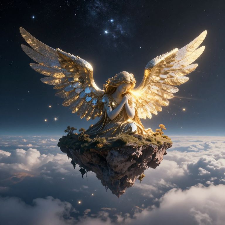A surreal 3D-rendered floating island, shaped like a serene sleeping angel, drifts through a cosmic expanse, its ethereal breath igniting vibrant golden supernova-like bursts against a star-studded sky, evoking a dreamlike, otherworldly atmosphere.