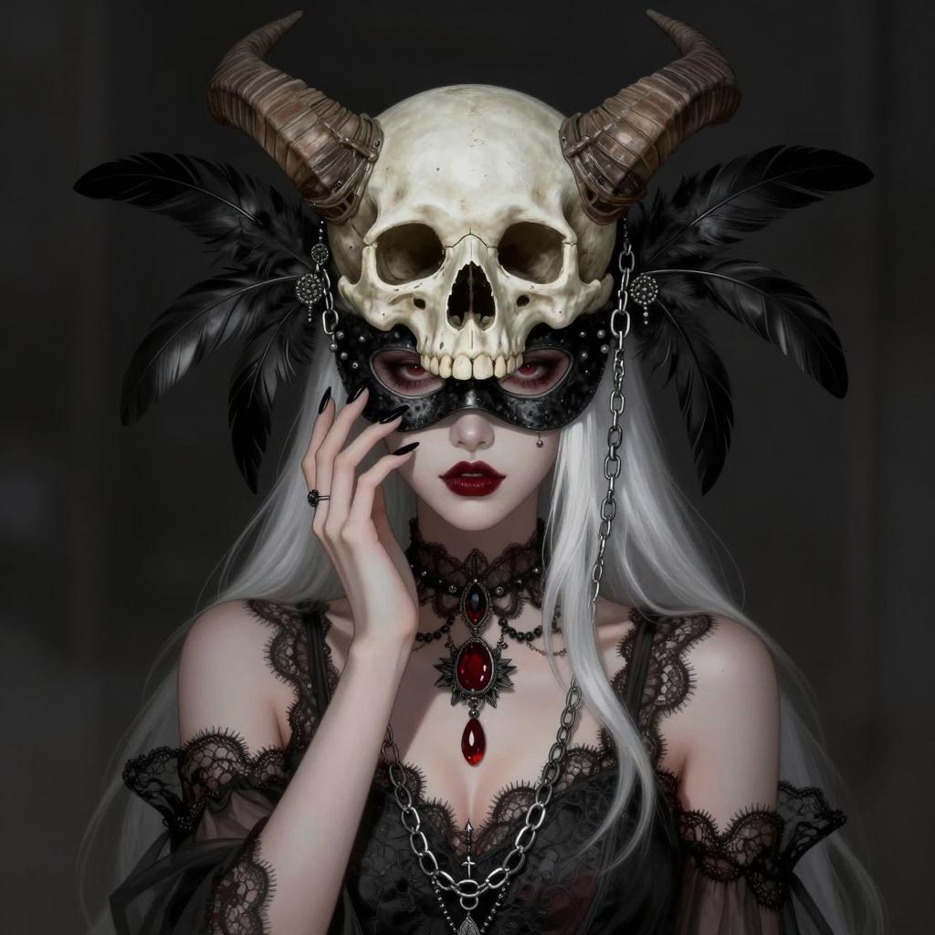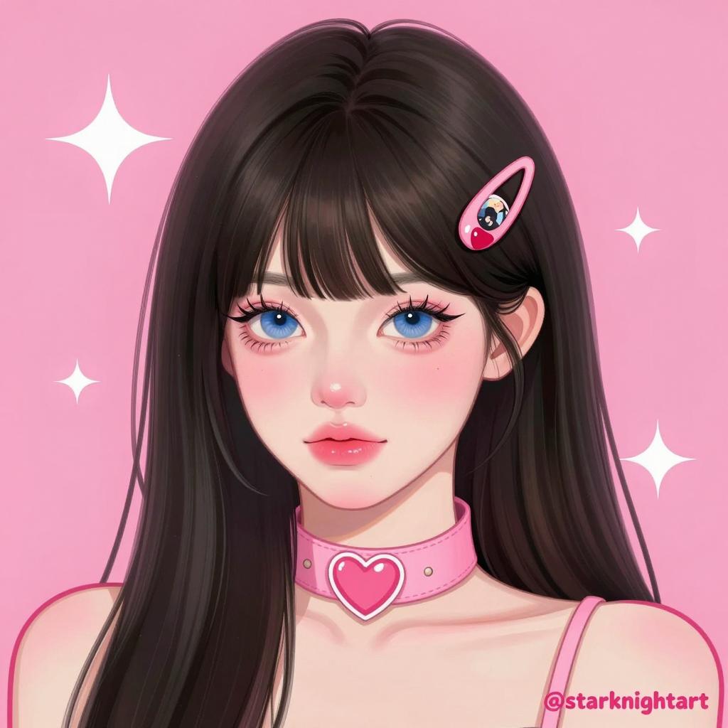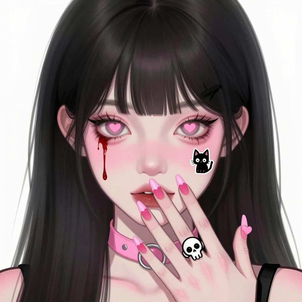 Digital illustration of a young woman with purple-pink skin, black hair with straight bangs, heart-shaped pupils in wide eyes, blood dripping from her right eye, a small black cat sticker on her left cheek, and a hand with pink nails and a skull ring covering her mouth. Pink blush marks on her cheeks, heart-shaped nails, and a pink choker.