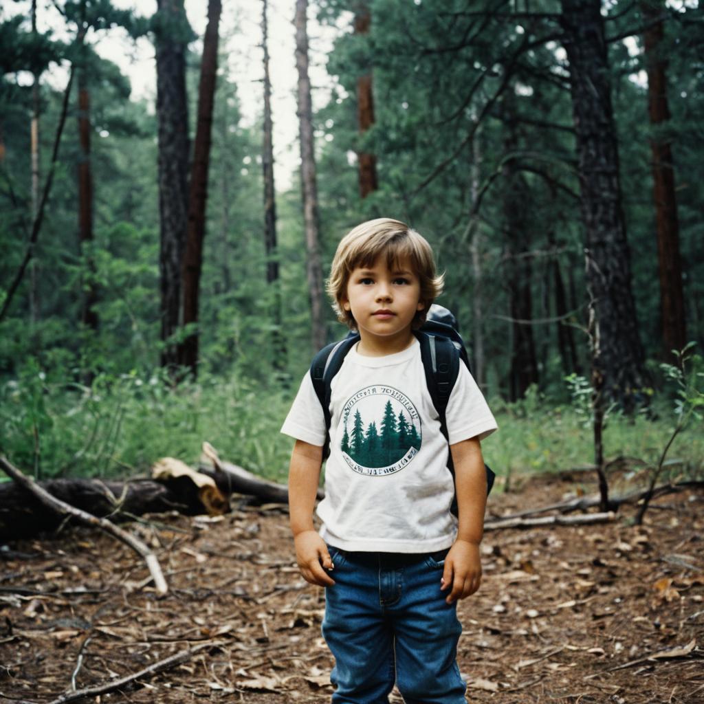 A young boy with light brown hair, wearing a white t-shirt with a tree design, blue jeans, and a black backpack, stands in a dense forest setting. The child looks directly at the camera with his arms relaxed at his sides. The natural background includes tall trees and forest ground covered with leaves and branches.