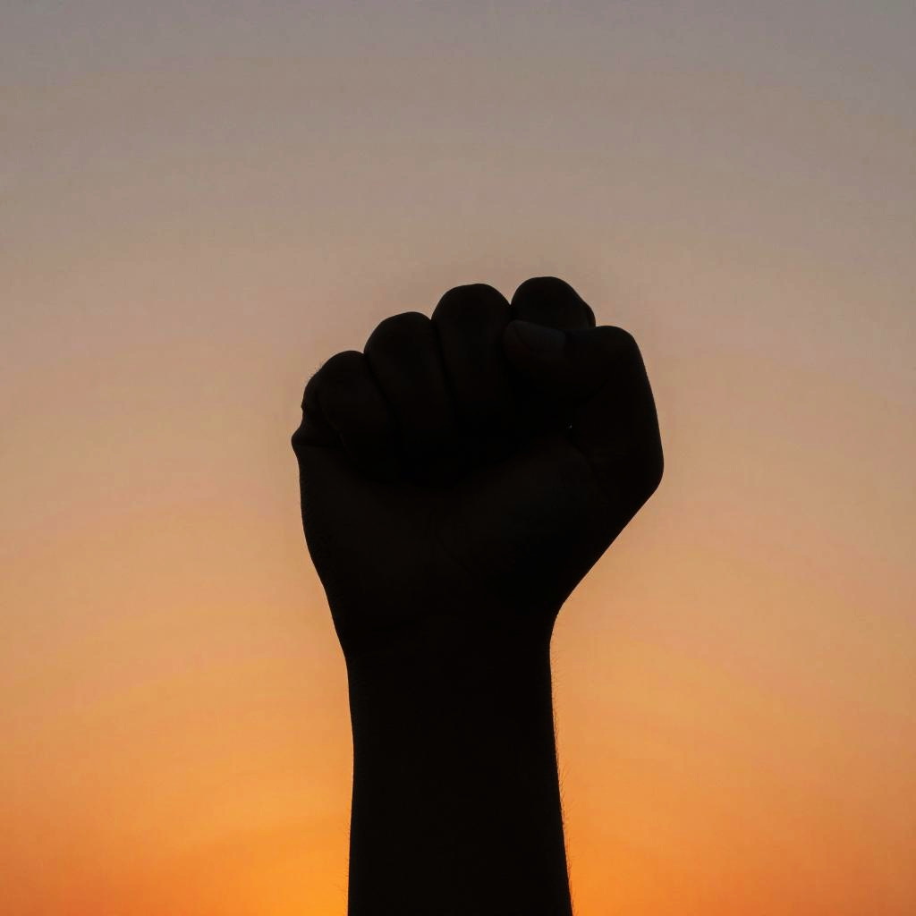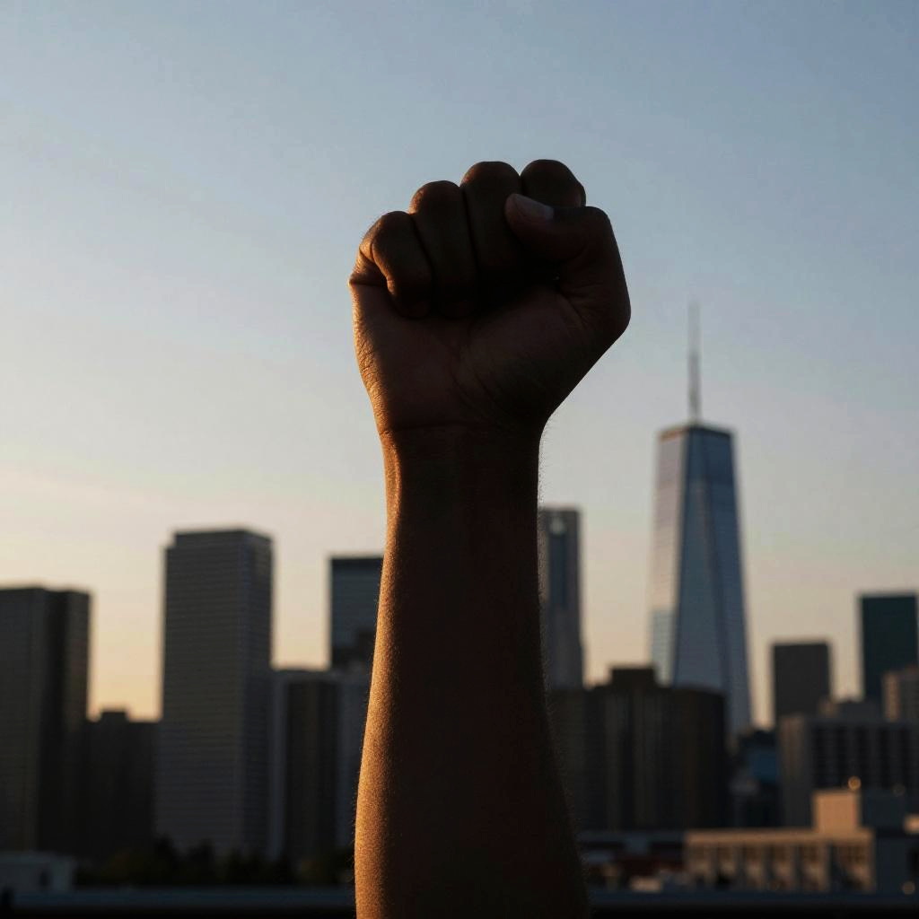 Fist silhouette raised high in front of a city skyline at dusk, bold and symbolic gesture standing out with sharp contours, dynamic lighting highlighting textures of the hand, urban vibe with a touch of empowerment and resistance
