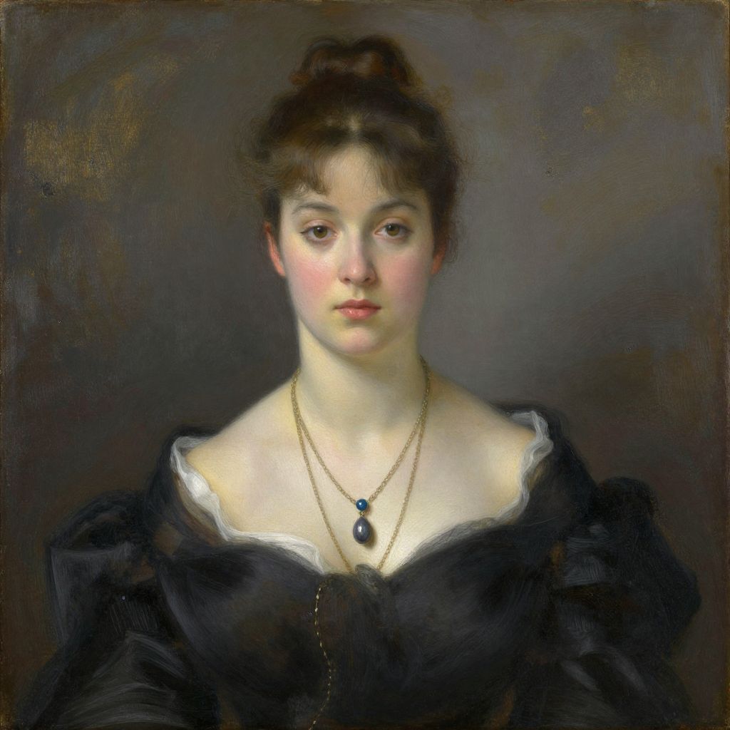 Realistic oil painting of a young woman with fair skin, brown hair in an updo, wearing a black dress with white lace, gold necklace,