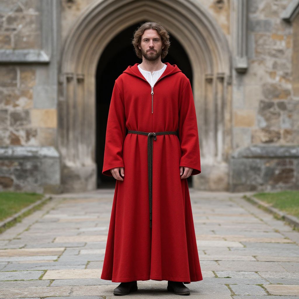 Red Medieval Dress, man in red robe standing in front of a stone building