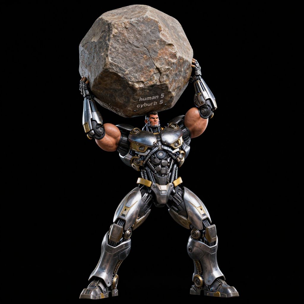 In this highly detailed and realistic image, a muscular male cyborg is depicted lifting a massive boulder, showcasing an impressive display of strength and engineering. The cyborg, labeled as \"human 5 cyborg 5,\" is fully equipped with advanced mechanical components, including a metallic exoskeleton, sleek armor, and high-tech gloves. The boulder, a large, cracked stone with a hexagonal pattern, is being held aloft with remarkable ease, highlighting the cyborg's incredible physical capabilities. The scene is set against a stark black background, which accentuates the vivid colors and textures of the cyborg and the boulder, creating a striking contrast. The lighting is strategically placed to emphasize the musculature and mechanical details, adding depth and dimension to the image. The overall composition is dynamic, with the cyborg positioned in a powerful stance, exuding a sense of determination and strength.