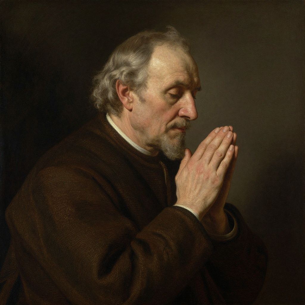A solemn elderly man in prayer, depicted in a Rembrandtesque style with dramatic lighting and rich, earthy tones, is captured in this high-definition digital artwork reminiscent of Rembrandt van Rijn's iconic compositions, rendered on canvas with a focus on deep shadows and intricate details.