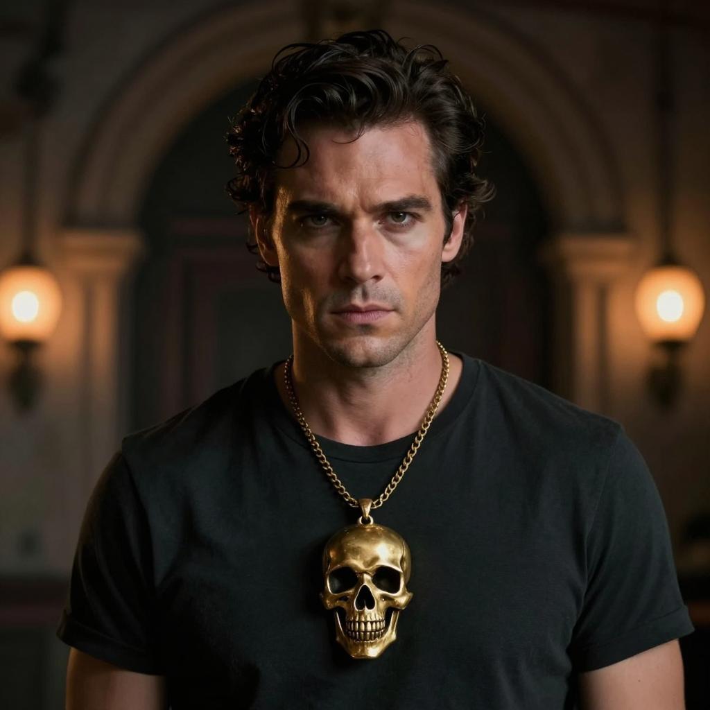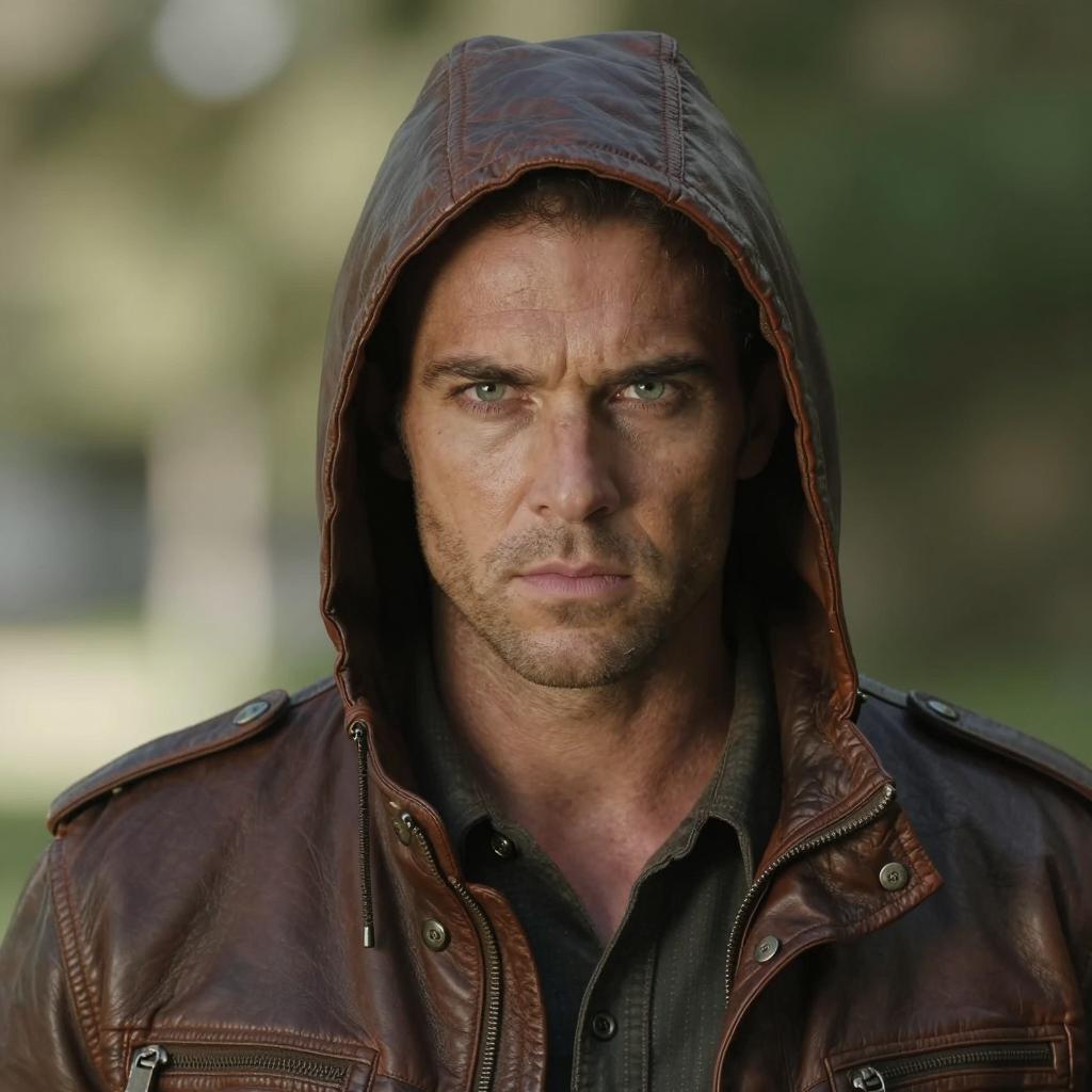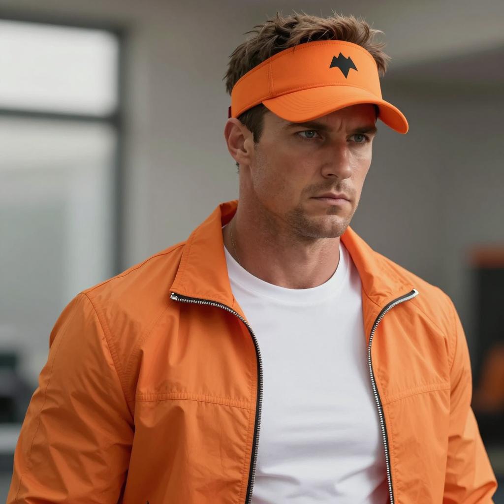 Jailbird costume orange, photo-realistic, male, medium shot, muscular build, brown hair, short hair, orange and white sports visor with black silhouette , serious expression, blue eyes, orange zip-up jacket, white t-shirt, indoor, blurred background, natural light, digital art, close-up, semi-realistic style, modern, athletic, casual outfit, slightly glossy skin, strong jawline