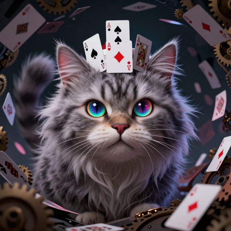 The image depicts a highly detailed and intricate digital illustration of a Cheshire Cat, rendered in a hyper-realistic and hyper-detailed style. The cat's face is adorned with an elaborate crown made of poker cards, each card meticulously crafted and arranged to form a castle-like structure. The cat's eyes are large and vibrant, with neon glowing reflections that add a sense of depth and intensity. The fur is long and fluffy, with shades of white and gray, and the whiskers are long and flowing. The background is dark and moody, with a sense of movement and chaos, as if the cat is emerging from a vortex of cards and gears. The overall composition is dynamic and complex, with the cat's face taking center stage and the surrounding elements creating a sense of depth and perspective. The image is a stunning example of digital artistry, with a level of detail and realism that is both impressive and captivating.