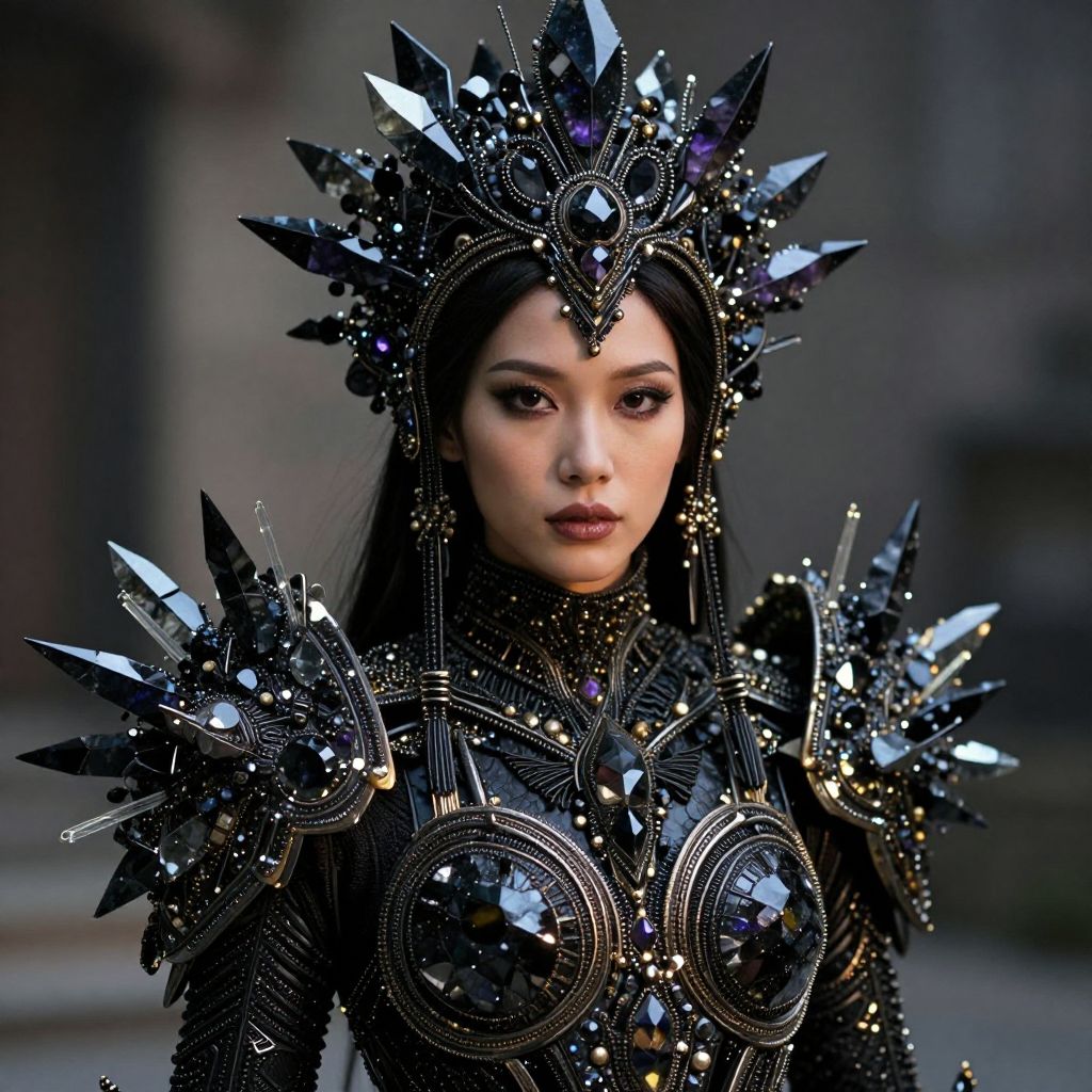Photorealistic digital artwork of an Asian woman with pale skin, wearing an elaborate, black, crystal-embellished crown and armor, set against