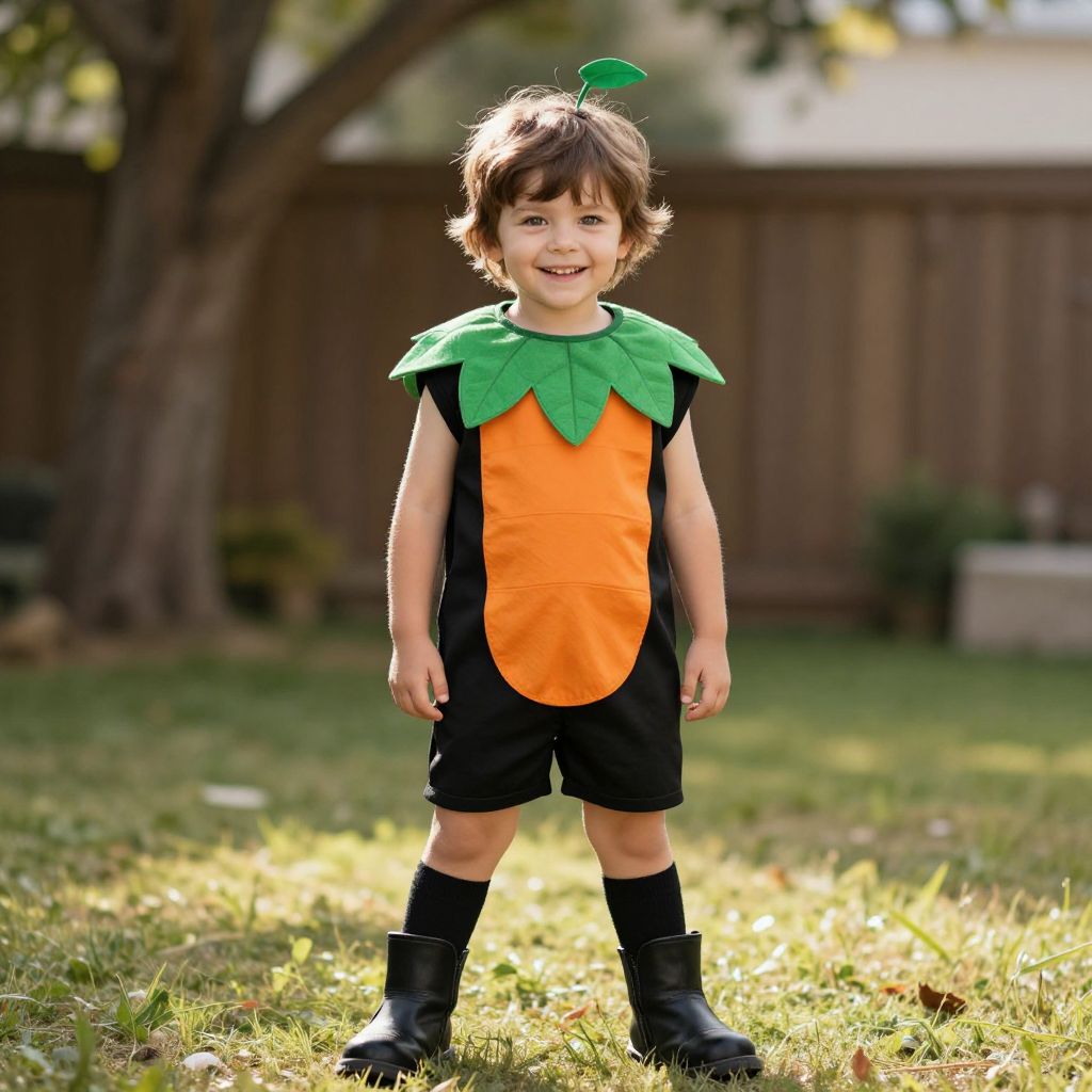 Photograph of a young boy in a fluffy white and pink costume with red circles, standing in a sunlit backyard.