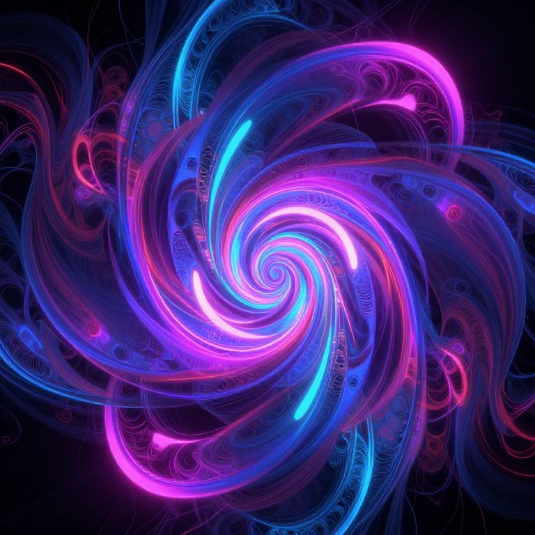 Neon digital art of swirling, vibrant purple, blue, and pink abstract patterns against a black background, creating a dynamic, hypnotic spiral effect.