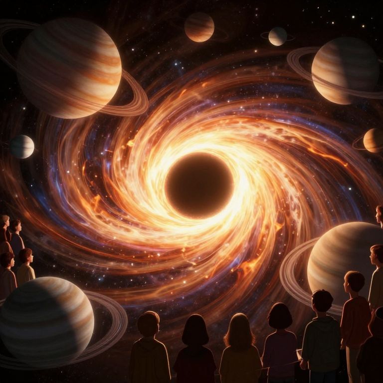 In a mesmerizing digital art rendering, a central black hole radiates a brilliant glow, surrounded by a swirling, fiery accretion disk, as a choir of orbiting planets, each with distinct textures and hues, appear to listen intently, their paths bent by the gravitational pull, creating a cosmic ballet of light and shadow.