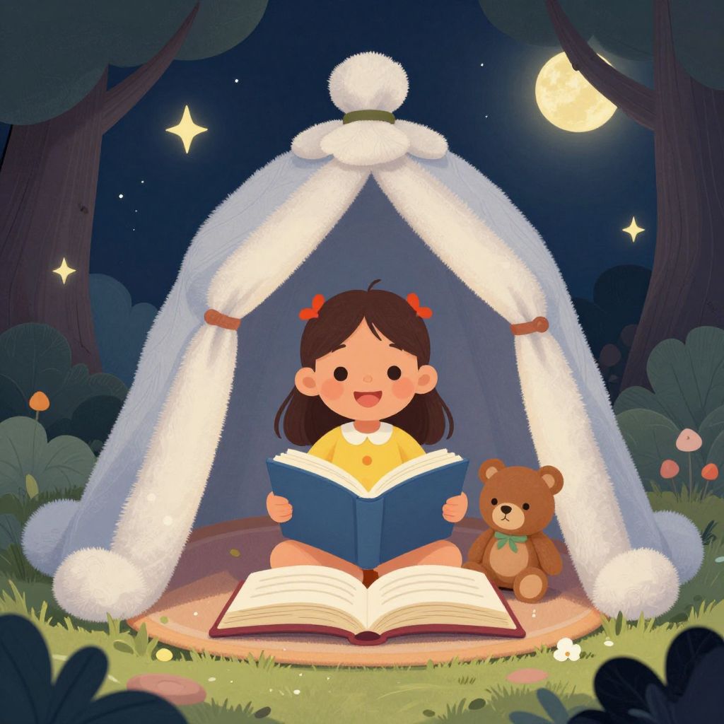 Digital illustration of a cute, young girl with brown hair and red hair bows, sitting cross-legged inside a white, fluffy tent at night. She wears a yellow shirt and reads an open blue book, smiling happily. Beside her is a small brown teddy bear. The tent has a fluffy top with a white pom-pom. The background features a dark blue night sky with a full moon, stars, and trees. The grassy ground has scattered flowers and small mushrooms. The style is whimsical and cartoon-like, with vibrant colors and soft textures.