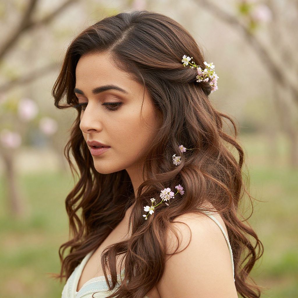 Kriti Sanon hair adorned with delicate floral accessories, soft waves blending with nature, serene expression, pastel color scheme with a springtime garden backdrop, ethereal and elegant