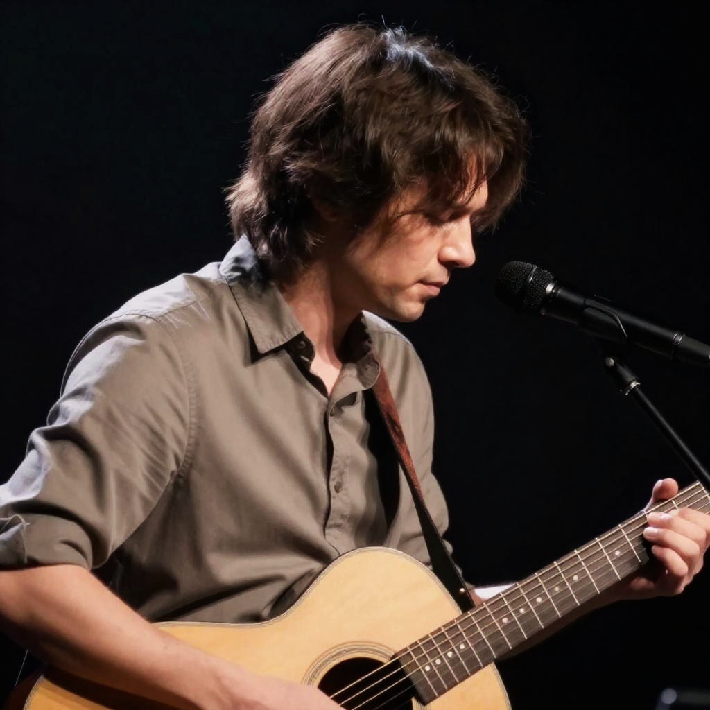 Man with Guitar in Dimly Lit Room