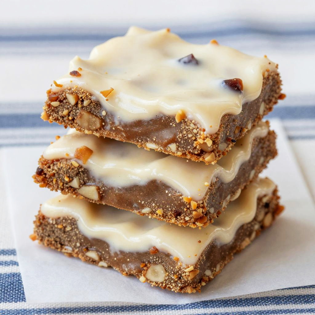 This is a close-up photograph of three rectangular, cookie-like bars stacked on top of each other. They're covered in a generous layer of creamy white frosting, sprinkled with small bits of what looks like nuts or crumbs. The bars have a brown, slightly crispy texture. They're placed on a white piece of paper that's set on a blue and white striped fabric background. The lighting makes the frosting look shiny and the nuts give a crunchy contrast.