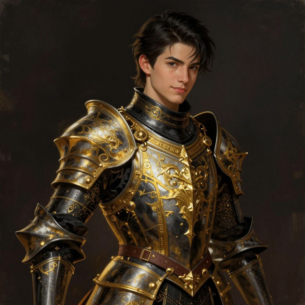 Digital portrait of a handsome young man with dark hair, wearing ornate golden and black medieval armor, standing against a dark background.
