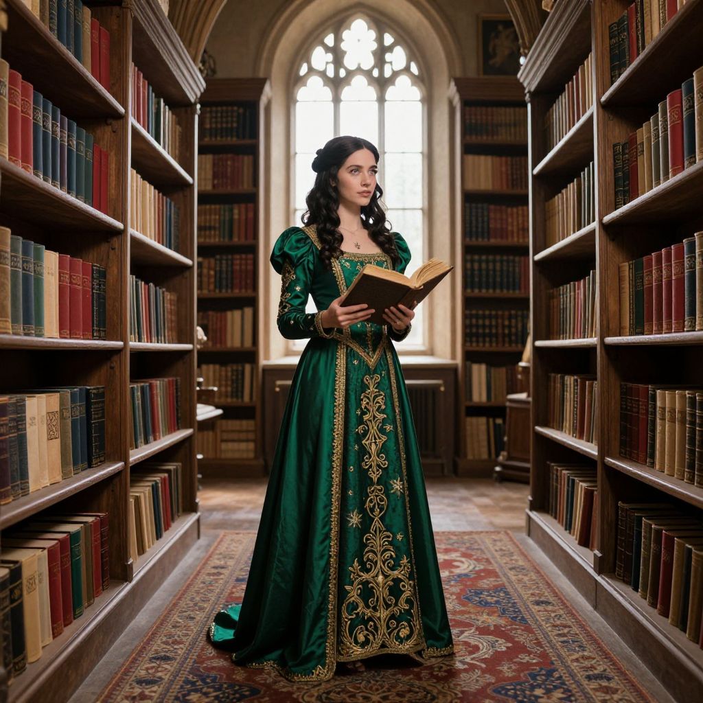 In a grand, medieval library, a woman dressed in a lush, emerald green gown with intricate gold embroidery stands confidently, holding an open book. Her dark, wavy hair is styled in an elegant updo, adding to her aristocratic appearance. The library is filled with shelves of books, their spines a mix of vibrant colors and intricate designs, suggesting a rich collection of knowledge. The floor is adorned with a patterned carpet, and the large, arched windows allow natural light to filter in, casting a warm glow on the scene. The overall atmosphere is one of quiet studiousness and the allure of magic, evoking a sense of fantasy and the timeless allure of learning.