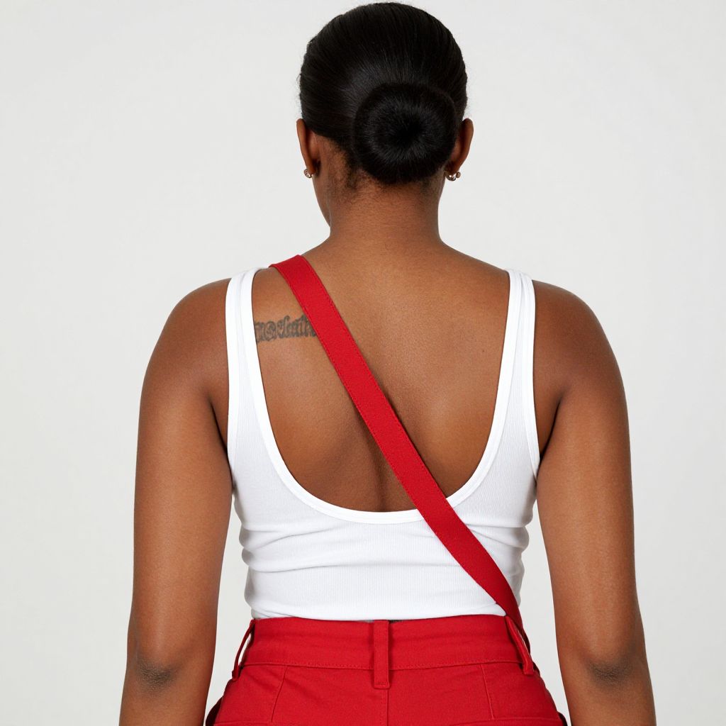 Photograph of a woman seen from behind, displaying her dark brown skin and athletic build. She has her black hair neatly tied in a bun. She wears a white, sleeveless tank top with a deep back and bright red high-waisted pants. A red diagonal strap crosses her back from right to left. A small tattoo in cursive script is visible on her upper left back. The background is plain white, making her vibrant outfit and dark skin stand out prominently. The image has a clean, studio-lit appearance.