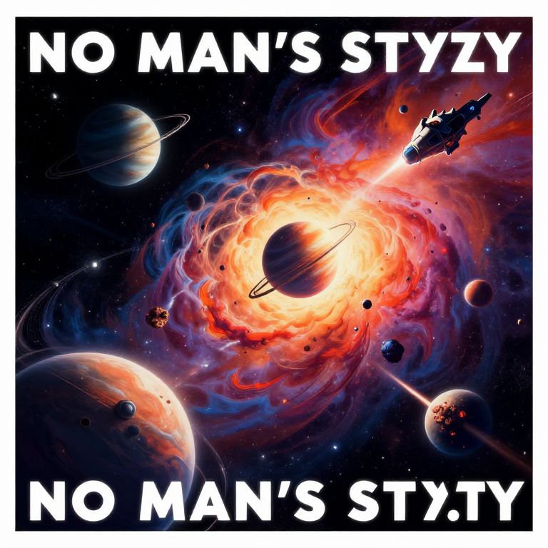 Digital artwork: Vibrant space scene with a fiery, swirling vortex at the center, planets, and a spaceship. Bold white text reads "NO MAN
