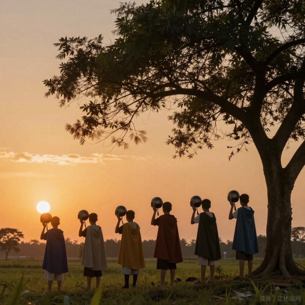 Group of seven boys standing outdoors at sunset under a large tree, each holding a helmet above their heads. They are dressed in various colored cloaks and capes, facing the sun near the horizon with an orange sky and grassy landscape.
