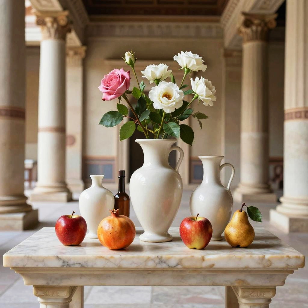 Classic Greco-Roman fresco, marble altar table in ancient temple courtyard, still-life featuring three white vases of varied shapes and a small brown bottle with a dark top; pink roses and white flowers with lively green leaves; fruits arranged around them: a red apple, a yellow-orange pomegranate, another red apple, and a small brown pear with a green leaf; warm sunlight filtered through majestic colonnades; realistic textures, crisp edges, gentle reflections, soft falloff, color-true, editorial quality