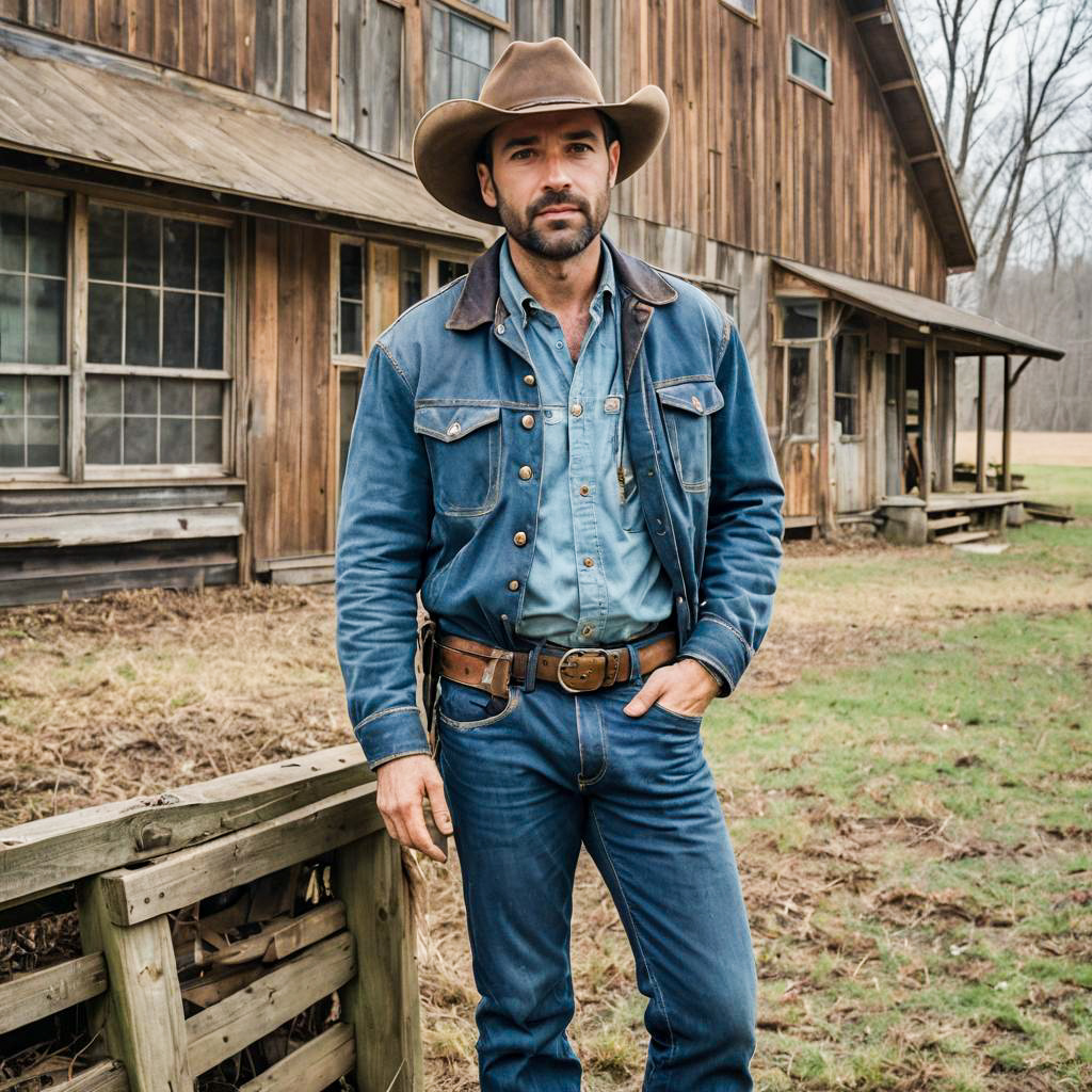 Portrait of a rugged build man with a side part hairstyle wearing a country outfit consisting of a worn-in chambray shirt, a rugged canvas jacket with brown collar accents, blue jeans, and a leather belt. He stands confidently against a textured multi-colored brick wall with dry leaves on the ground. The man's expression is serious and intense, complemented by a beard and a watch on his wrist.