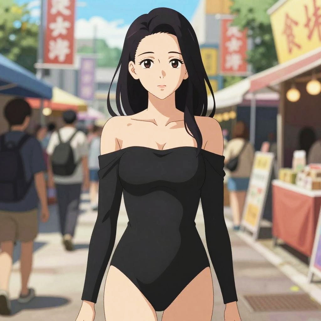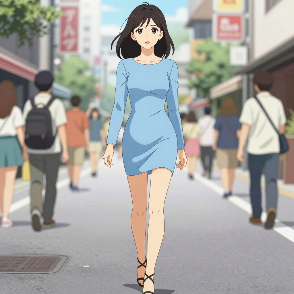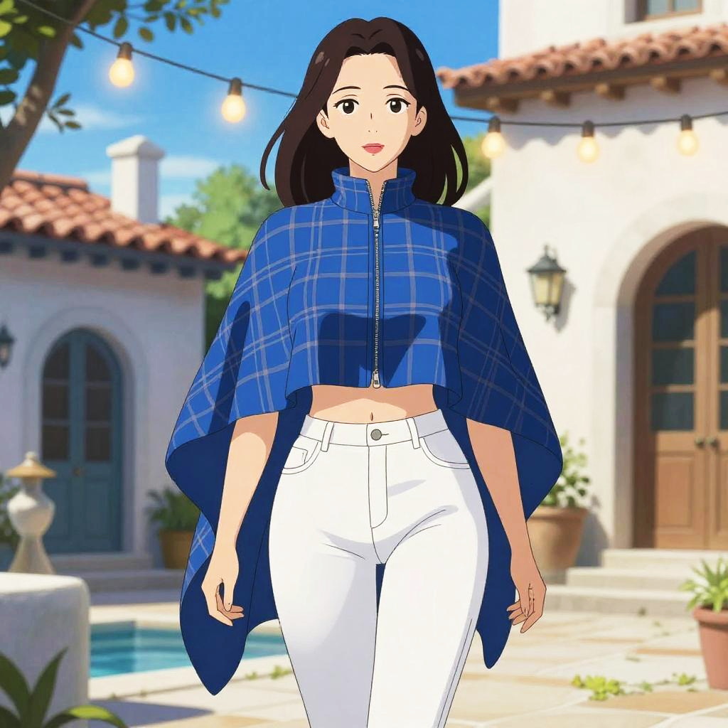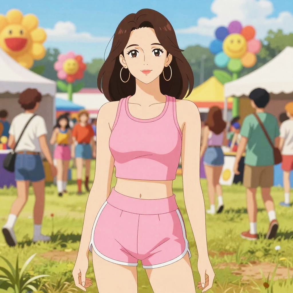 A woman, in a Kyoto Animation style, wearing a teal cropped hoodie and high-waisted joggers with white side stripes, black sneakers, standing in a vibrant bazaar in a town center. Sexy. Pretty face and beutiful eyes