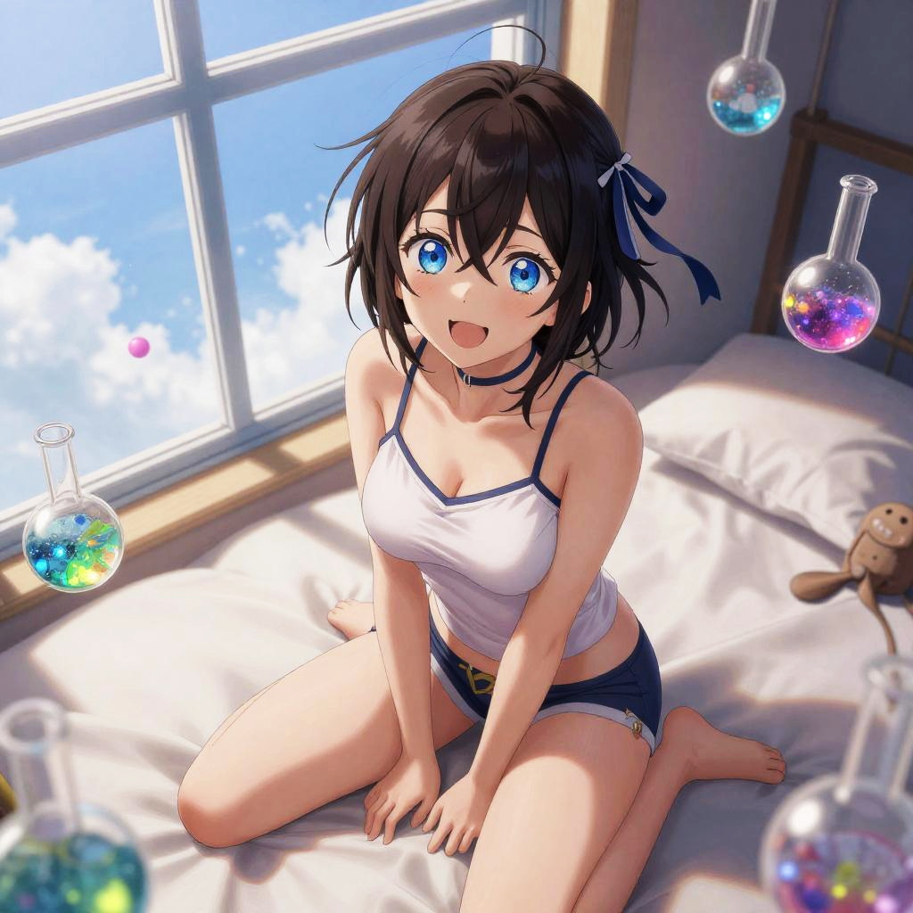 Digital anime-style drawing of a cute, young woman with short, black hair and large, blue eyes, sitting on a bed with white sheets. She wears a white, spaghetti-strap tank top that reveals her cleavage and black, lace-trimmed underwear. The room is bright with sunlight streaming through a window in the background, showcasing a blue sky with white clouds. Floating around her are colorful, glowing glass beakers, and a small stuffed toy is on the bed. Her expression is cheerful and inviting, with a slight blush on her cheeks. The overall atmosphere is playful and cozy.