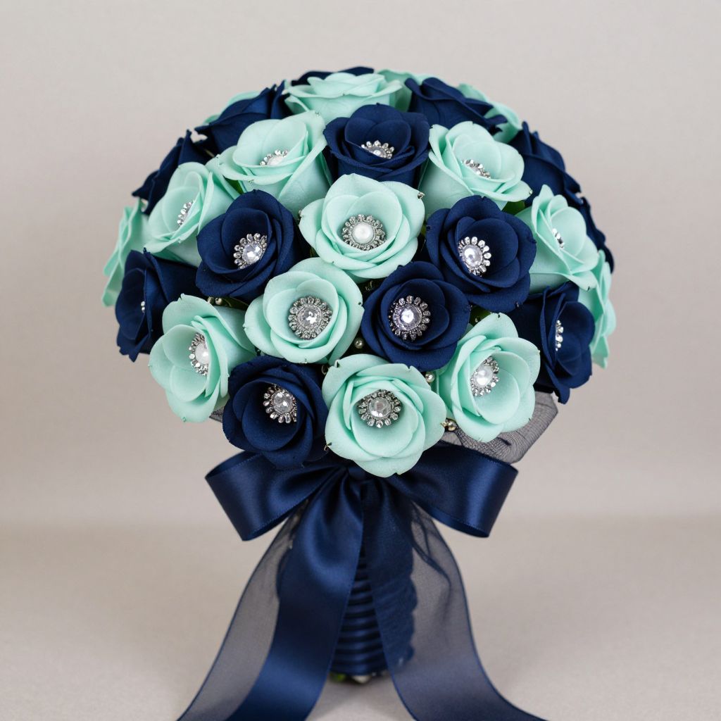 Photograph of a round bouquet featuring a mix of dark navy blue and light mint green fabric roses. Each rose has a silver, rhinestone-like center. The bouquet is wrapped with a large, dark navy blue satin ribbon tied into a bow at the bottom. The background is plain white, emphasizing the bouquet's colors and textures. The fabric roses have a soft, velvety appearance, and the rhinestones add a sparkling contrast to the matte fabric petals. The ribbon's sheen contrasts with the matte roses, creating a visually appealing composition.