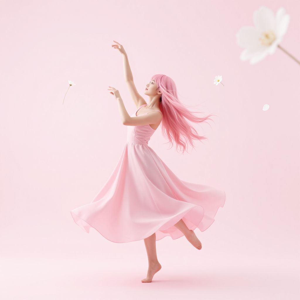A woman with long pink hair and a pink dress dances gracefully against a light pink background, surrounded by fluttering white flowers and particles of light, evoking a peaceful, serene atmosphere.