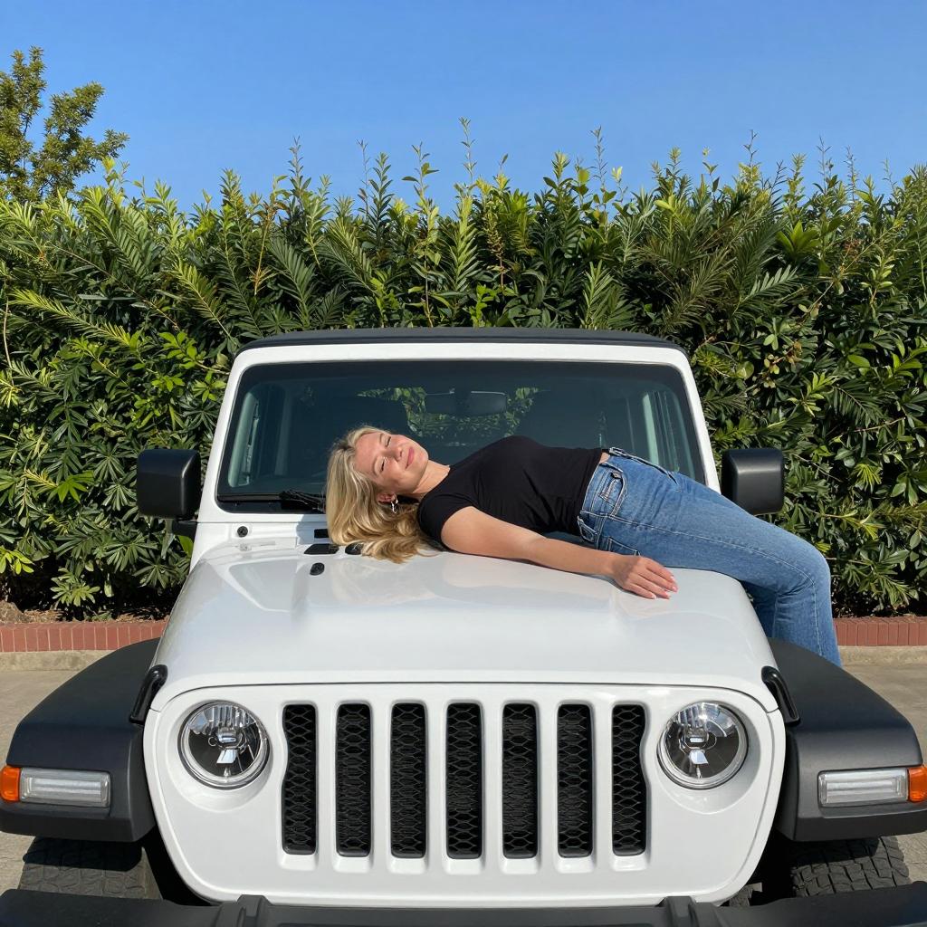 Nude woman with short brown hair stands in front of black SUV, tan desert landscape in background, rocky hilltop center. Black SUV, red rims, open door. Woman barefoot, standing upright, hands at sides. Desert vegetation scattered. Overcast sky.