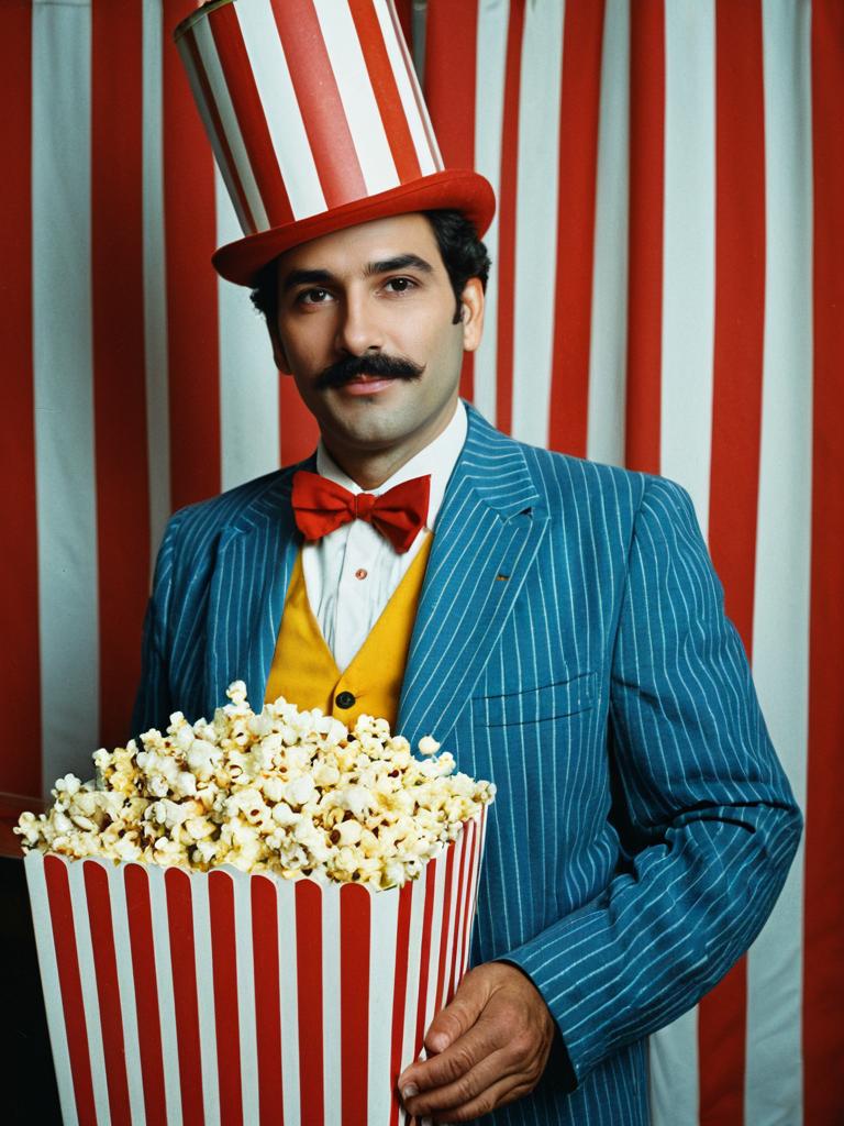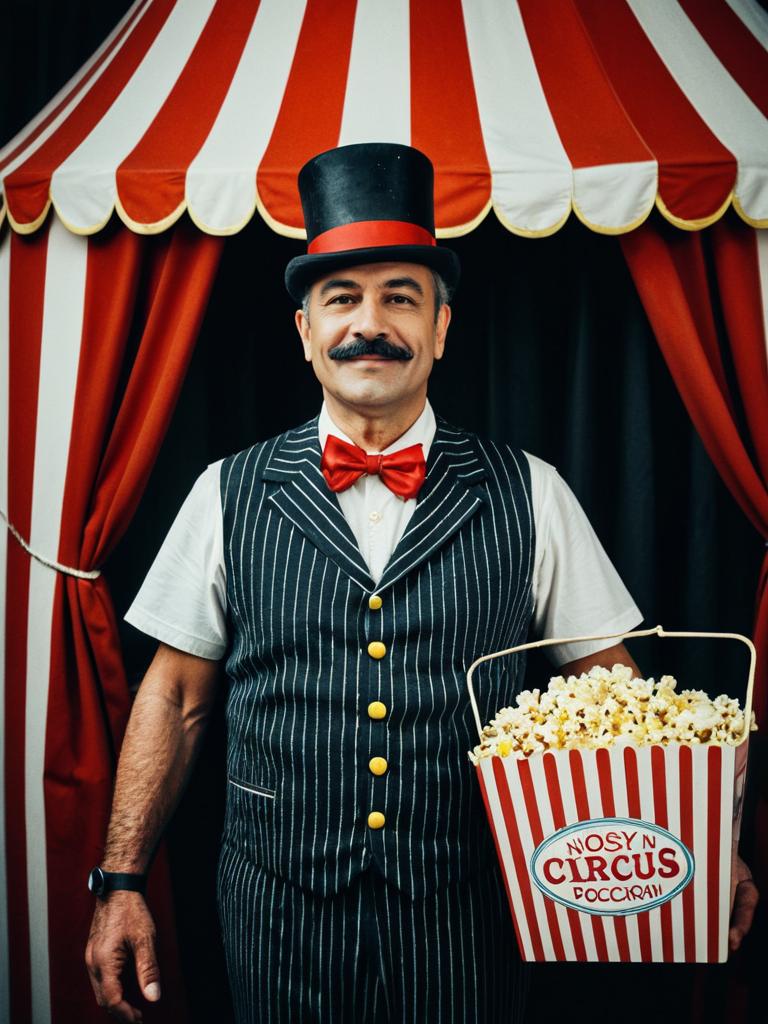 Man in Circus Popcorn Seller Costume, photorealistic detailed studio portrait