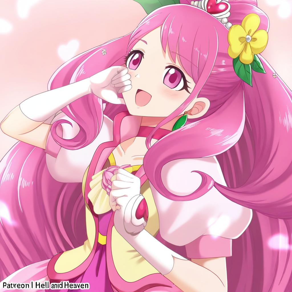 Anime-style illustration of a magical girl character with long pink hair adorned with a heart-shaped hair ornament and yellow flower. She has vibrant pink eyes and is wearing a pink dress with a yellow vest, white gloves, pink choker, and puffy short sleeves. The character has a cheerful expression and an overall bright, pastel ambiance with soft heart-shaped light effects in the background.