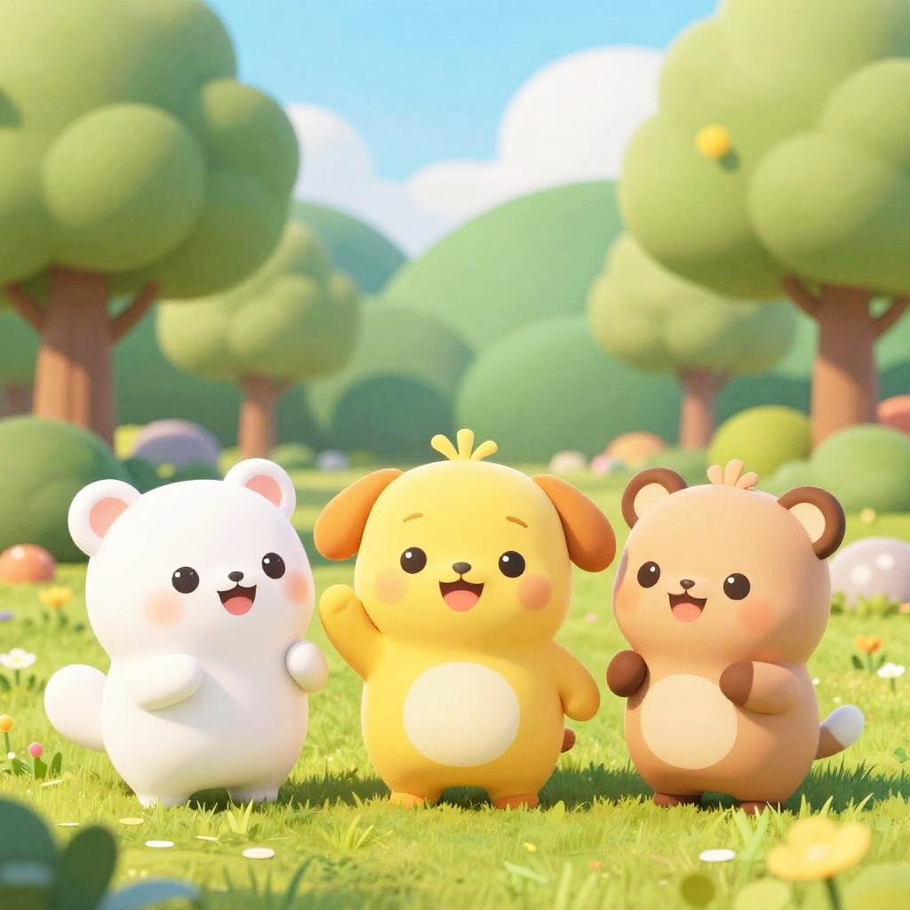 Cartoon art AI generator crafting adorable animal mascots with expressive eyes and rounded shapes, set in a cheerful park scene with lush greenery and playful interactions, smooth shading and soft gradients emphasizing a friendly and heartwarming vibe