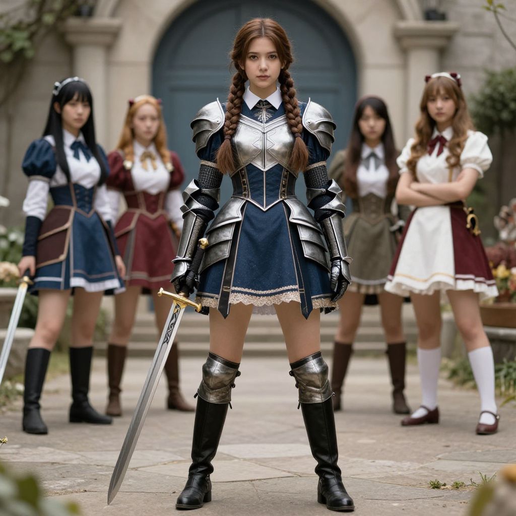Alice wonderland knight, armor, brown hair, solo focus, twin braids, braid, dress, multiple girls, long hair, standing, 2girls, boots, weapon, 1girl, sword, full body