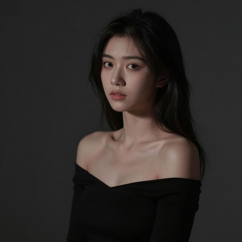 Best quality, masterpiece, ultra high res, (photorealistic:1.4), raw photo, 1girl, offshoulder, in the dark, deep shadow