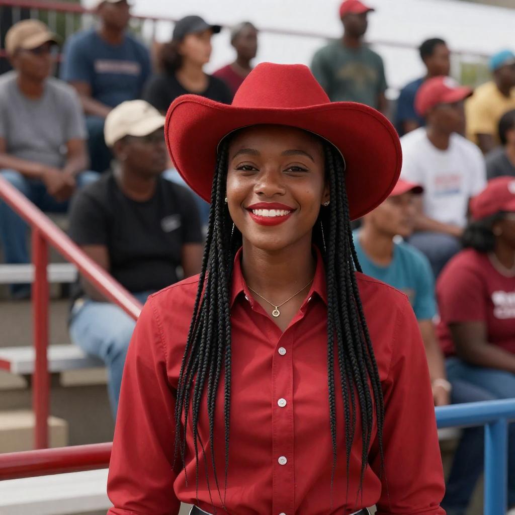 Photograph of a smiling Black woman with long braids wearing a red cowboy hat and red button-up shirt. She has red lipstick and wears a delicate necklace. The woman is standing in front of a crowd seated in bleachers, with people casually dressed in hats and varied clothing. The setting is bright and outdoors with red and blue metal railings visible in the foreground.