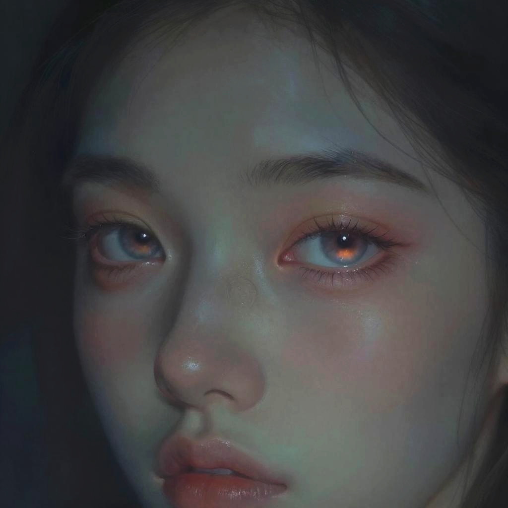 Surreal portrait of a person with luminous blue tinted eyes, surrounded by floating light orbs and abstract shapes, painterly with soft brush strokes and deep shadows