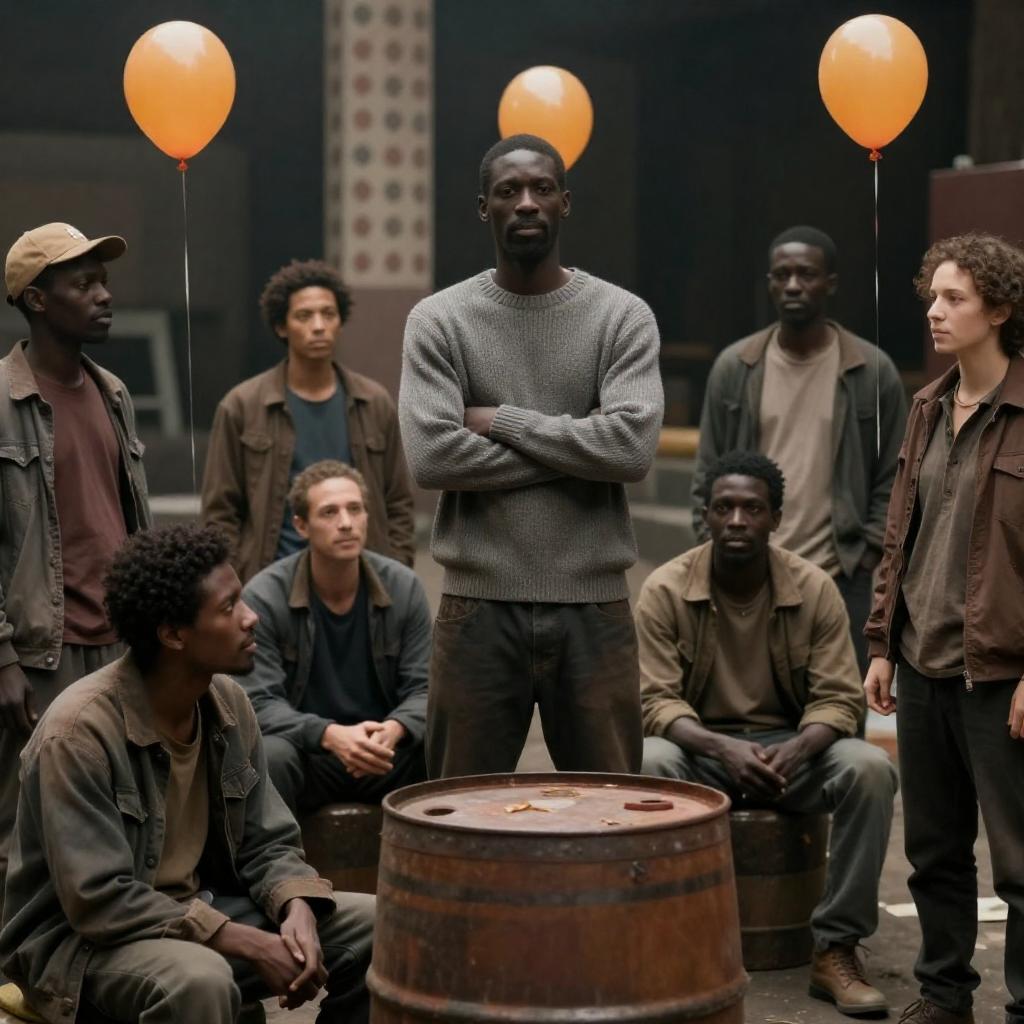 Photograph of a group of people in a crowded, dimly lit indoor setting. Central figure, a white male with fair skin, wearing a gray hooded jacket and red shirt, gesturing with his right hand. Surrounding him, several men with diverse ethnic backgrounds, wearing layered clothing and winter hats, with varied facial expressions, mostly neutral to serious. One man in the background covers his mouth with his hand. The scene has a tense atmosphere.