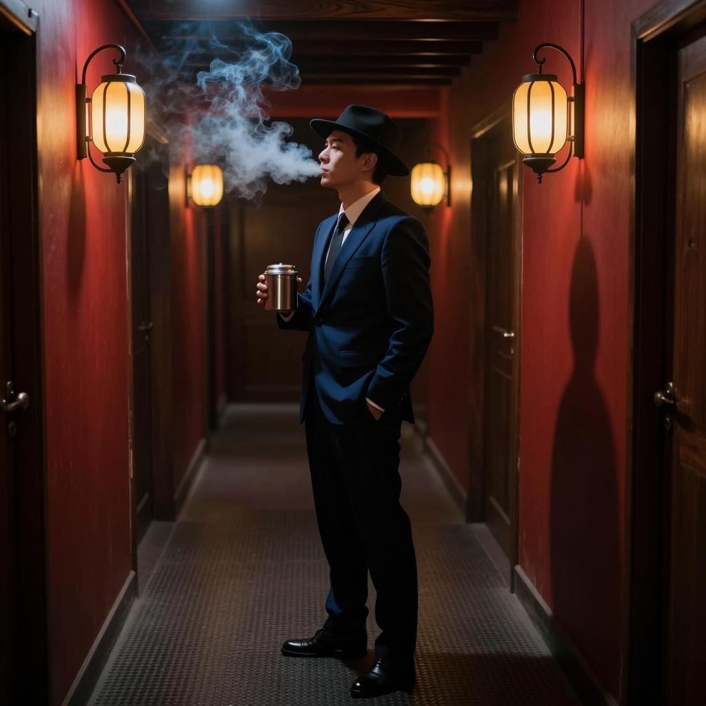 Man in navy suit, black hat, smoking, exhaling blue smoke. Holding metal container. Dark hallway with red-lit walls, two yellow lanterns. Standing in middle of corridor, looking left. Textured floor, wooden walls. Shadows and light create contrast.